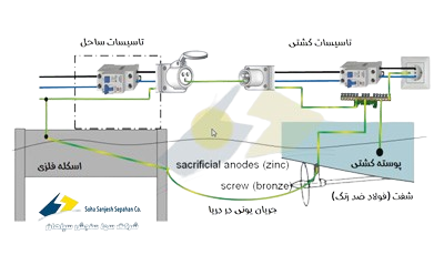 در ابتدای امر به نظر حالت مناسبی برای ایجاد اتصال زمین مشترک ما بین کشتی و ساحل می باشد اما با دقت بیشتر در می یابیم در این حالت به دلیل اتصال فلز اسکله و روتور (پروانه) فلزی کشتی به یکدیگر توسط سیم ، خوردگی رخ میدهد.. راهکاری دیگر برای برق رسانی به کشتی استفاده از ایزولاتورهای گالوانیک می باشد.کاربرد این ایزولاتور ها بدین صورت است که برای عبور جریان ac اتصال کوتاه هستند اما در برابر عبور جریان هایی که سبب خوردگی می شود مدار باز هستند و لذا از بروز خوردگی جلوگیری می کند.