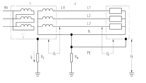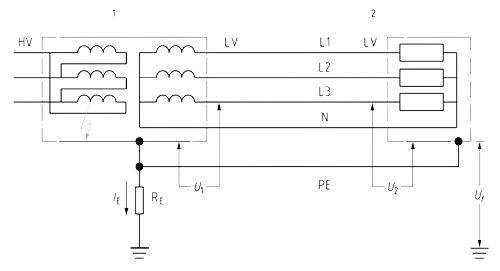 اگر مقاومت این الکترود زمین مشترک نسبت به جرم کلی زمین RE باشد و در صورت وقوع اتصالی بین یک هادی فاز با بدنه هادی در فشار قوی شدت جریان برابرIE باشد، ولتاژ بدنههای هادی فشار قوی و فشار ضعیف هر دو نسبت به جرم کلی زمین برابر با RE.IE (ولت) خواهد بود. نظر به اینکه در سیستم TN که دارای یک اتصال به زمین در پست ترانسفورماتور است، بدنه هادی تجهیزات فشار ضعیف از طریق یک هادی مشترک حفاظتی/ خنثی (PEN) یا هادی حفاظتی (PE) به بدنههای هادی فشار قوی وصل میباشد. پتانسیل Uf که پتانسیل خطا نامیده میشود برابر همین مقدار خواهد بود: Uf = RE . IE این ولتاژی است که ممکن است هر فردی را که در هر منطقهای از تاسیسات با بدنه متصل به سیستم همبندی تجهیزات فشار ضعیف یا فشار قوی است دچار برق گرفتگی نماید. البته ولتاژ تماس)Uc ولتاژی که ایجاد برق گرفتگی می کند(، قدری کوچکتر از Uf خواهد بود: Uf Uc < نتیجه این که با توجه به اتصال هادی نوترال و بدنه تابلو ها به یک دیگر میزان افزایش ولتاژ نوترال در اثر اتصال کوتاه ( Uf )برابر افزایش ولتاژ بدنه تجهیزات به همین مقدار نیز خواهد شد در نتیجه با توجه به ثابت بودن ولتاژ فاز به نول ولتاژ فاز به بدنه نیز ثابت باقی خواهد ماند. U2=U1=U0 ولتاژ تنش هر فاز فشار ضعیف نسبت به بدنه ترانسفورماتور (بدنه فشار قوی) یا U1که قبل از وقوع اتصال کوتاه برابر U0 بود بعد از وقوع اتصال کوتاه در همان مقدار باقی میماند،همچنین ولتاژ تنش هر فاز فشار ضعیف نسبت به بدنه تجهیز فشار ضعیف U2که قبل از وقوع اتصال کوتاه برابر U0 بود بعد از وقوع اتصال کوتاه در همان مقدار باقی میماند: حالت دوم : بكارگیری سيستم هاي زمین مجزا در پستهاي ترانسفورماتور زميني در شكل زیر طرحواره يك پست ترانسفورماتور زميني كه داراي دو اكترود اتصال زمين مستقل است نشان داده شده است.