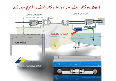 در ابتدای امر به نظر حالت مناسبی برای ایجاد اتصال زمین مشترک ما بین کشتی و ساحل می باشد اما با دقت بیشتر در می یابیم در این حالت به دلیل اتصال فلز اسکله و روتور (پروانه) فلزی کشتی به یکدیگر توسط سیم ، خوردگی رخ میدهد.. راهکاری دیگر برای برق رسانی به کشتی استفاده از ایزولاتورهای گالوانیک می باشد.کاربرد این ایزولاتور ها بدین صورت است که برای عبور جریان ac اتصال کوتاه هستند اما در برابر عبور جریان هایی که سبب خوردگی می شود مدار باز هستند و لذا از بروز خوردگی جلوگیری می کند.
